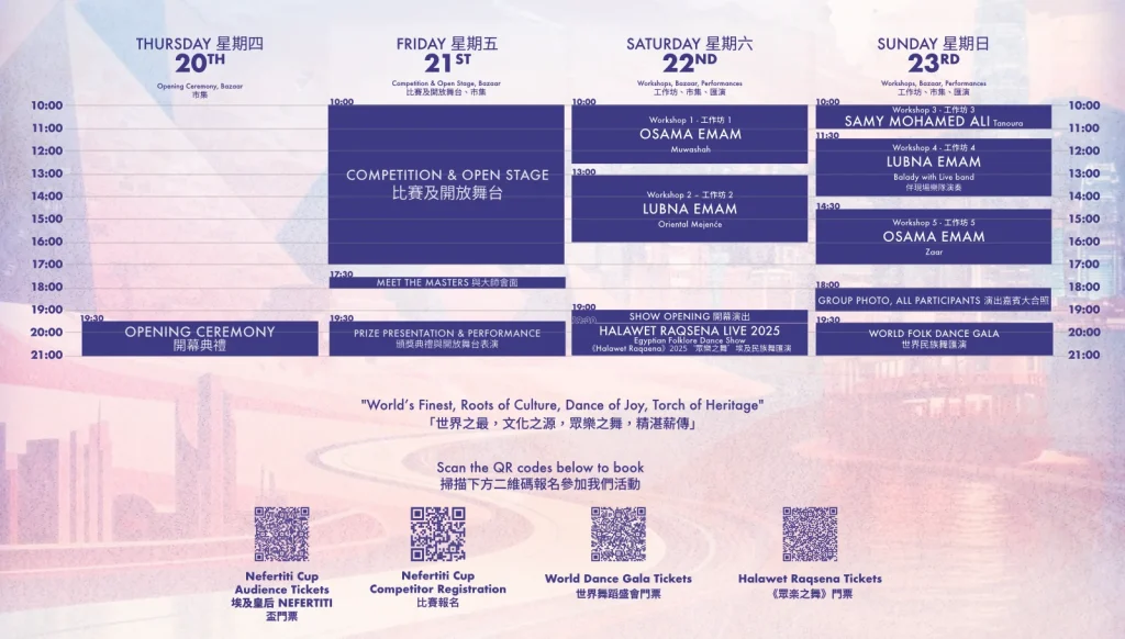 欣賞來自埃及與其他海外舞蹈團體呈現的精彩表演與音樂,與大家一起度過一個難忘的傳統民俗舞蹈之夜。